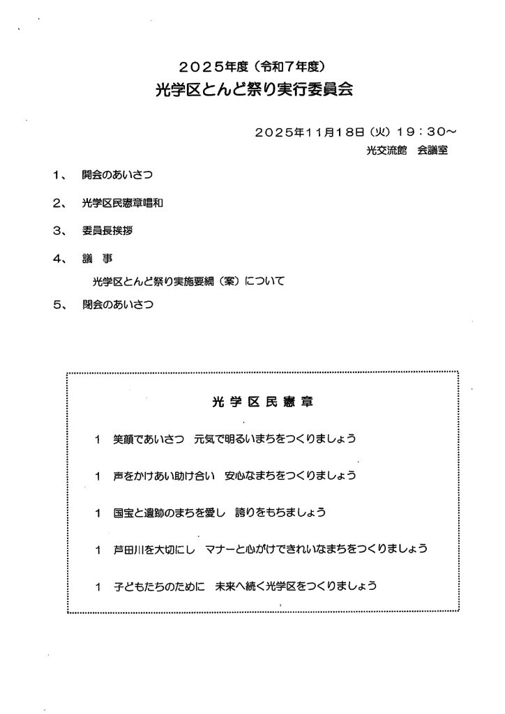 2025年11月20日 / 最終更新日時 : 2025年11月20日 管理人 お知らせ 光学区とんど祭り実行委員会 11月19日に、令和7年度の光学区とんど祭り実行委員会が開かれました。来年1月18日に光小学校のグラウンドで、とんど祭りが開催されます。 コメントを残す コメントをキャンセルメールアドレスが公開されることはありません。 ※ が付いている欄は必須項目ですコメント ※ 名前 ※ メール ※ サイト 次回のコメントで使用するためブラウザーに自分の名前、メールアドレス、サイトを保存する。
