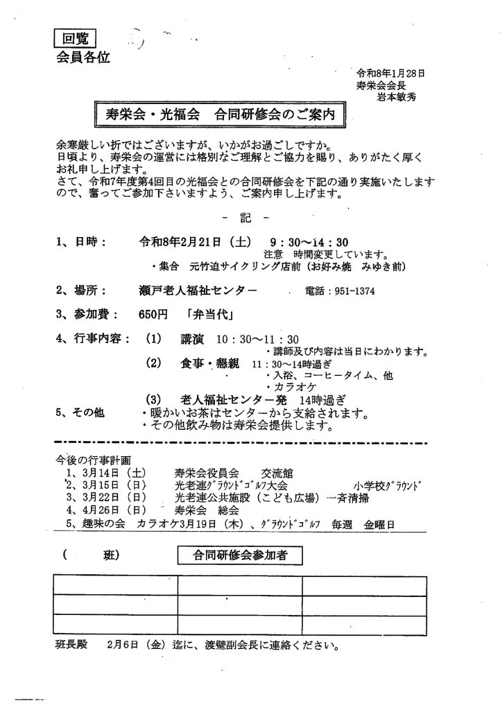 寿栄会・光福会 合同研修会のご案内 2月21日