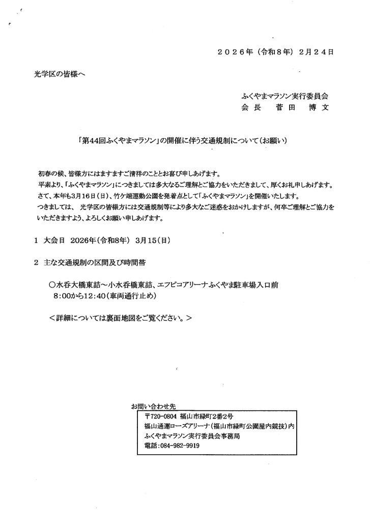 「第44回ふくやまマラソン」交通規制について 3月15日